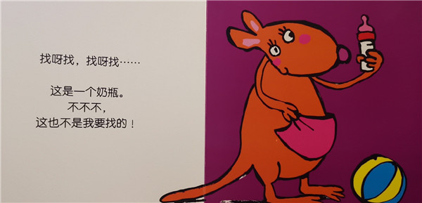 咦?袋鼠妈妈好像在找东西呐!它一边不停念叨着“它在哪儿”,一边不断的从口袋里掏出一样又一样的东西,它在找什么呢?它找到了吗?这是一本典型的充满翻页惊奇的绘本,充满了互动性,结尾袋鼠妈妈抱出了小袋鼠将全书情绪推向了高潮,是集合了认知培养和情绪管理培养为一体的优秀绘本。