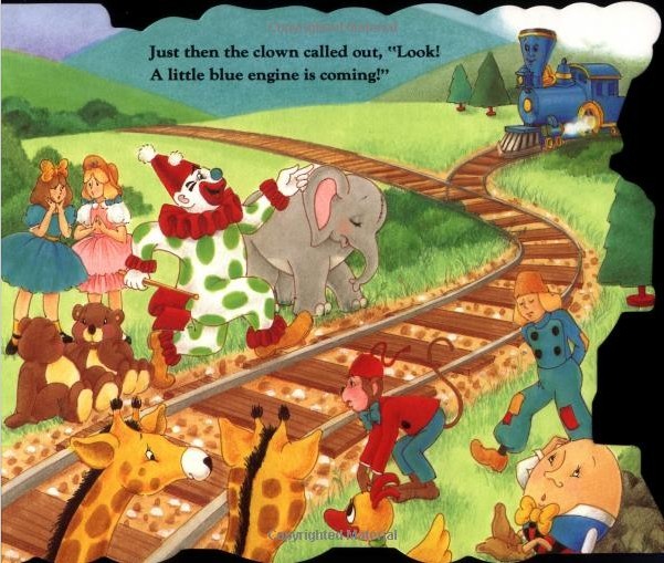 Although he is not very big, the Little Blue Engine agrees to try to pull a stranded train full of toys over the mountain. On die-cut board pages.