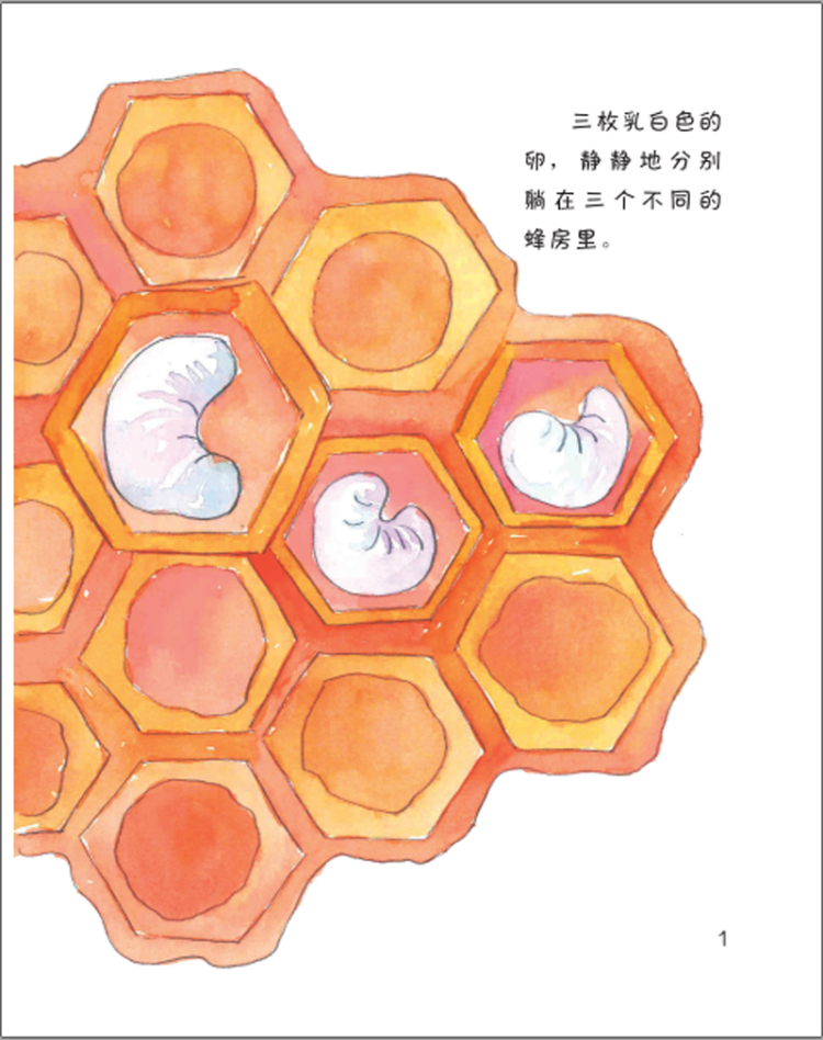 绘本以简练的文字,拟人化的生动的蜜蜂形象,分别记述了蜂王、工蜂、雄峰的孵化过程,因蜂种的不同、孵化阶段的不同,它们所吃的食物也有分别。