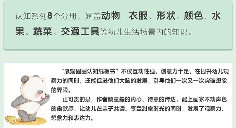 “熊猫圈圈认知纸板书”不仅互动性强,创意力十足,在提升幼儿观察力的同时,还能促进他们大脑的发展,引导他们一次又一次突破想象力的界限。更可贵的是,作者顽童般的内心,诗意的传达,配上画家不动声色的幽默感,让幼儿在亲子共读,享受甜蜜时光的同时,发展了观察力、想象力和表达了。