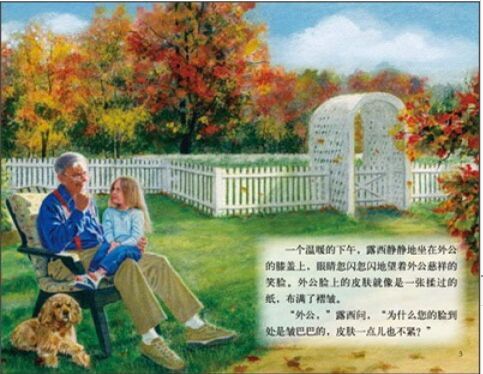 外公讲述了他脸上每条皱纹所带来的快乐往事:一条皱纹是结婚那天长出来的,一条是露西的妈妈出生时长出来的,一条是女儿结婚那天长出来的……露西一边听一边用她胖乎乎的小手轻轻地抚摸外公那饱经风霜的脸。
