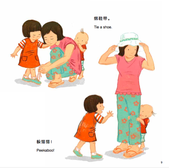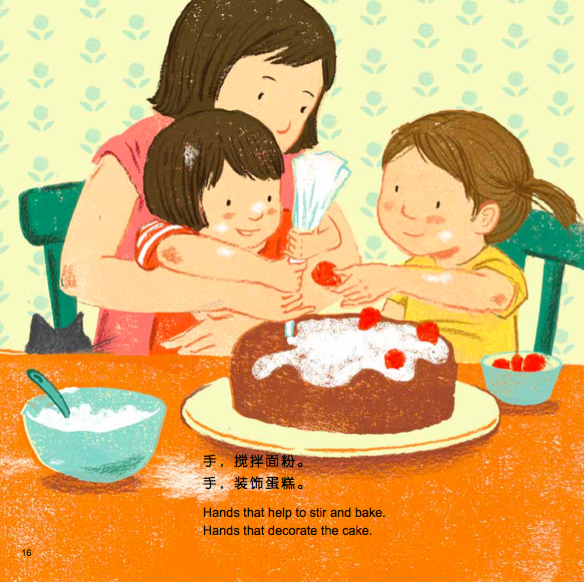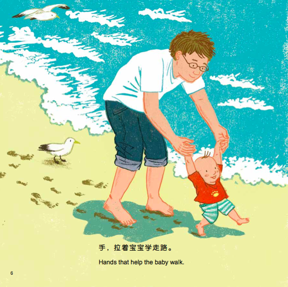 我们把书做成双语版,目的是想保留原文美丽押韵的句子。抱着孩子,与他共读这本书吧,一起回忆亲子间那些用手来表达爱的瞬间!