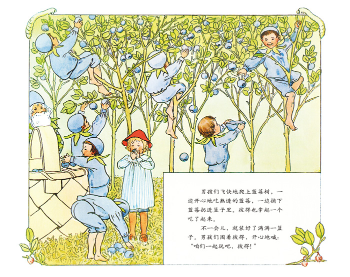 今天是妈妈的生日,小彼得想给妈妈一个惊喜。他挎上两个篮子来到了森林里,想摘小蓝莓和小红莓。可是,他没找到一颗莓果。就在他伤心时,一个还没有苹果大的小老头,对着他施展了魔法。哇,彼得一下子变得好小啊,原来他碰到的是蓝莓地国王!这下子,彼得踏上了神奇的蓝莓地之旅……