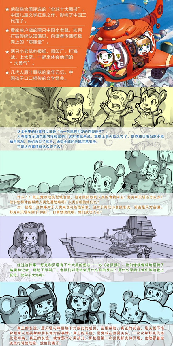 《舒克贝塔传》系列分10册,收录了“舒克贝塔历险记”350集的全部内容。本册中,舒克、贝塔办了一份《老鼠报》,试图改变改变老鼠们的素质。舒克得意地当上了总编辑,更神奇的是,这份《老鼠报》是在空中印刷的。报纸出来后,贝塔驾驶着坦克去送报。他俩干得不亦乐乎,却不料,老鼠家族为了争夺报纸已经大打出手,因为《老鼠报》居然成了老鼠世界的钱开始流通使用了。