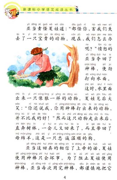 夏娃望着动物,哈哈大笑,说:“你也用不着那么生气嘛,看,你用神棒敲出来的动物也并不比我敲出来的好!”