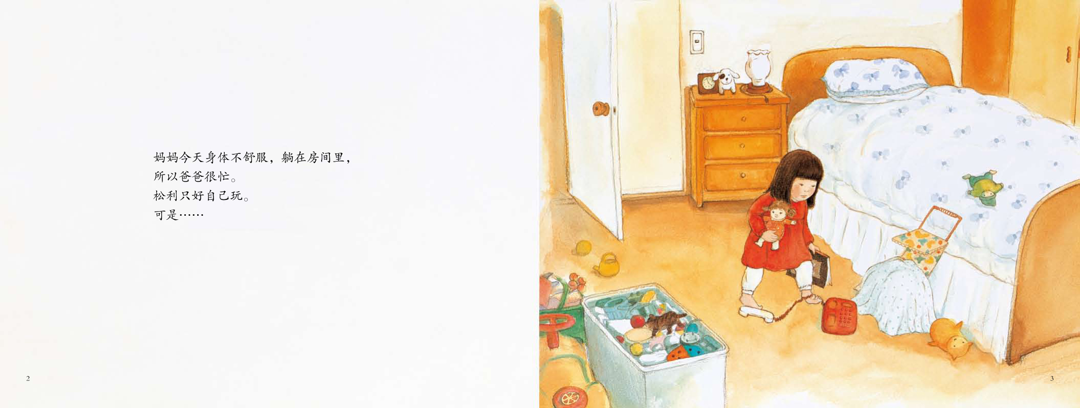 妈妈生病了,特别需要安静。爸爸承担起所有的家务,忙得焦头烂额。没有人说话,没有人玩耍,松利好孤单啊!她本来是打算做个懂事的乖孩子的,从她一遍又一遍重复的那句“现在不可以”完全看得出来。
