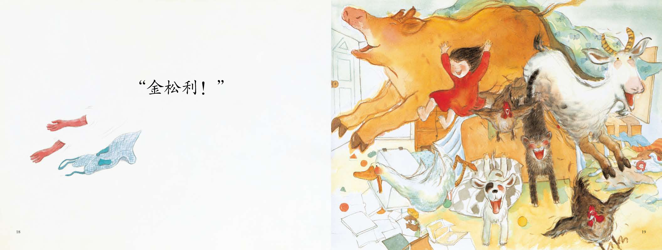 动物们都是从哪儿跑来的呢?如果细心一点的话,便不难发现:它们有的是玩具,有的则是图画书中的角色,是松利不甘寂寞的想像力把它们变活了,变成了自己快乐的玩伴。