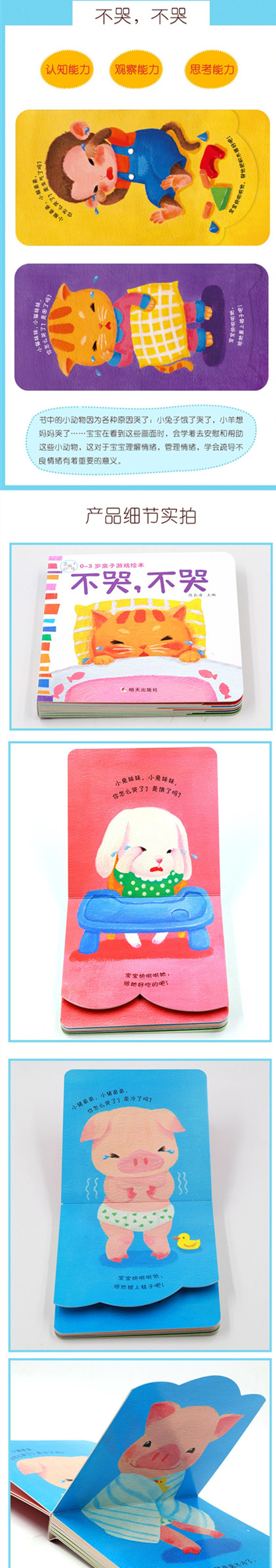 《不哭,不哭》关键词:情绪认知、亲社会行为书中的小动物因为各种原因哭了:小兔子饿了哭了,小象摔疼了哭了,小羊想妈妈哭了……宝宝在看到这些画面时,不仅能够体会和理解他们的情绪,而且还会学着去安慰和帮助这些小动物,这对于宝宝理解情绪,管理情绪,学会疏导不良情绪有着重要的意义。
