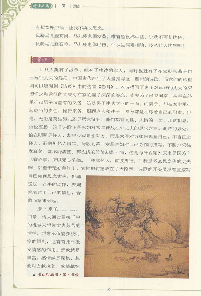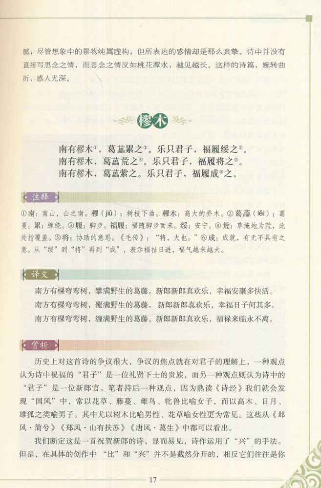 《诗经之美》一书是“美丽国学”系列丛书中的一种,是《诗经》选本,入选篇目都是历来公认的名篇。全书保持了风、雅、颂的体例,每篇分为原诗、注释、译文、赏析四部分,注释力求准确、简洁,并为生僻字词加注拼音。译文生动流畅,力求做到信、达、雅的完美统一。赏析则透彻分析诗的内容和艺术特色,从字面上切入《诗经》时代,从精神层面上贯通古今,拉近读者与《诗经》的距离。另外,本书插配了南画家宋马和之的代表作《毛诗》图卷以及其他一些与《诗经》诗意相吻合的中国古代山水花鸟画,用精美的版式设计将图片与文字融为一体,全方位构造了一个“诗中有画画中有诗”的《诗经》世界。