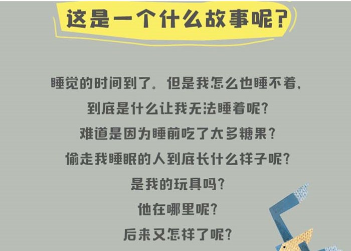 这是一本给3-6岁孩子阅读的睡前绘本。故事讲述了睡觉的时间到了。但是有一个小男孩怎么也睡不着,到底是什么让他无法睡着呢?难道是因为睡前吃了太多糖果?数绵羊也睡不着,他想知道是谁把睡眠偷走了,偷走睡眠的人到底长什么样子呢,是玩具吗,偷睡眠的人应该有很多牙齿……一个孩子因为睡不着,展开了各种各样的想象,偷走睡眠的到底是谁,他在哪里呢?
