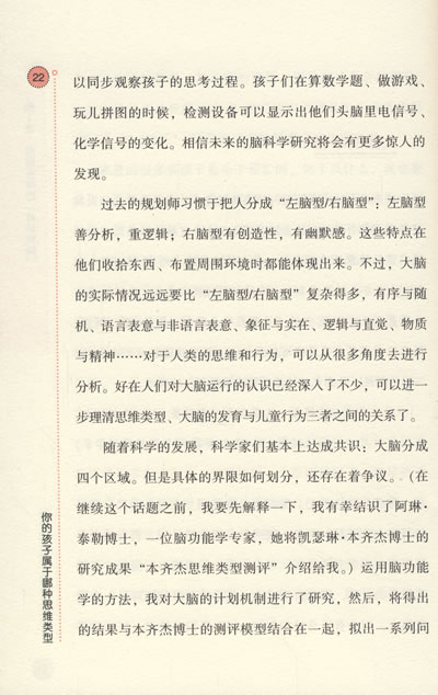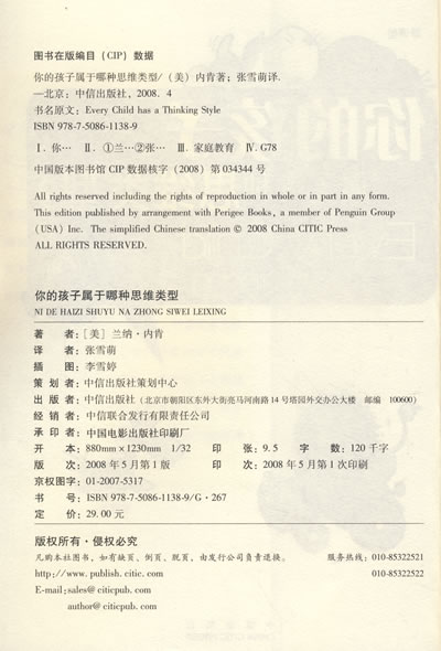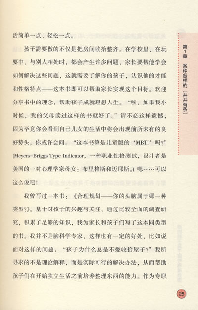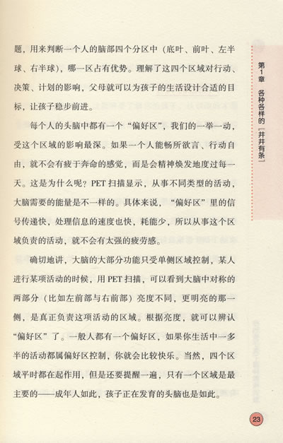 本书提供了生动翔实的例子、中肯的建议,还有步步到位的方案,具体包括:判断孩子思维类型的小测试,吸引孩子注意力、让孩子精神振奋的最奏效的教养方式,思维类型受到环境压制时,孩子会有哪些表现,“感觉偏好”对学习和人际关系的影响,对于一些有特殊问题的孩子,比如学习能力出现障碍,有哪些对策,为了家里的每一个人都生活得健康快乐,思维类型不同的家庭成员应如何相处等。