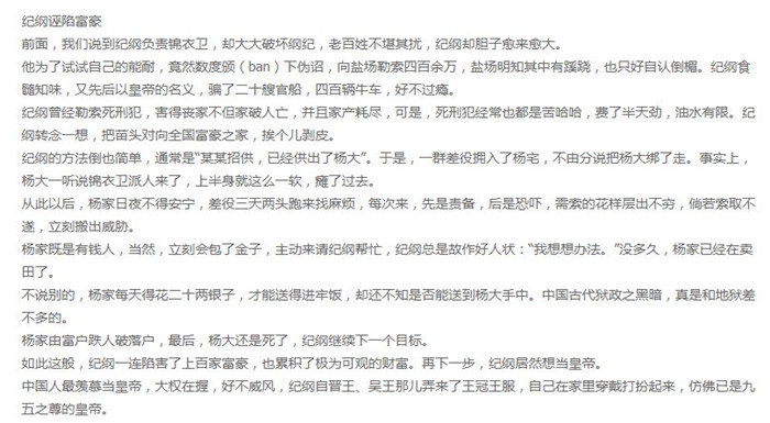 纪纲曾经勒索死刑犯,害得丧家不但家破人亡,并且家产耗尽,可是,死刑犯经常也都是苦哈哈,费了半天劲,油水有限。纪纲转念一想,把苗头对向全国富豪之家,挨个儿剥皮。