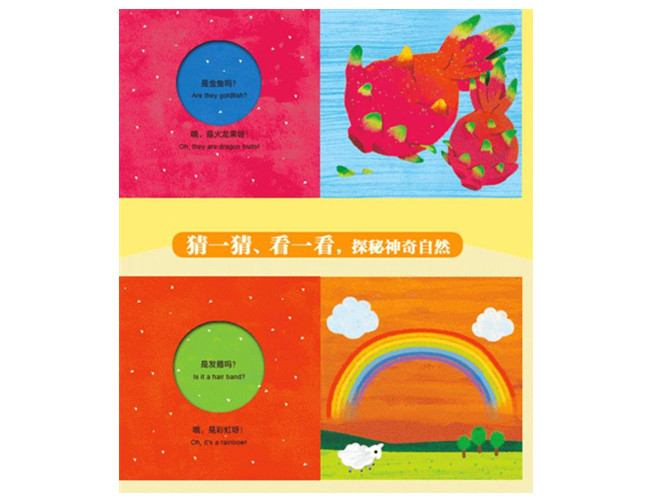 “‘宝宝没想到’主题认知洞洞书”是儿童诗人巩孺萍把丰富的生活常识、有趣的图画创意和巧妙的洞洞模切设计相结合,根据婴儿心智特征专门为0—3岁宝宝创作的认知洞洞书。作者按照认知的主题将原本完全不相关的两种事物通过好玩的创意联系在一起,让宝宝在翻来翻去、戳洞洞的过程中既认识了两种事物,又了解了这两种事物的特性与共性。同时,这部书稿的语言充满了韵律感,让宝宝被童诗般的汉语言中蕴藏的美感充分滋养,在好玩的洞洞游戏中认知世界、启蒙英语,同时提升观察能力、联想能力和理解能力。 《百变自然》是本系列中的一本,作者通过宝宝在生活中常见的事物,比如冰激凌、项链、蛋黄、棉花糖、发箍等来帮助孩子认识自然现象。比如,作者紧紧抓住项链上晶莹剔透的珠子和清晨户外叶片上的露珠的相似之处、宝宝每天都会吃的蛋黄的形态和天上的太阳的颜色的相似之处来引导孩子观察、认识和理解大自然中的现象,同时也启发孩子展开想象、积极联想,提升观察力。