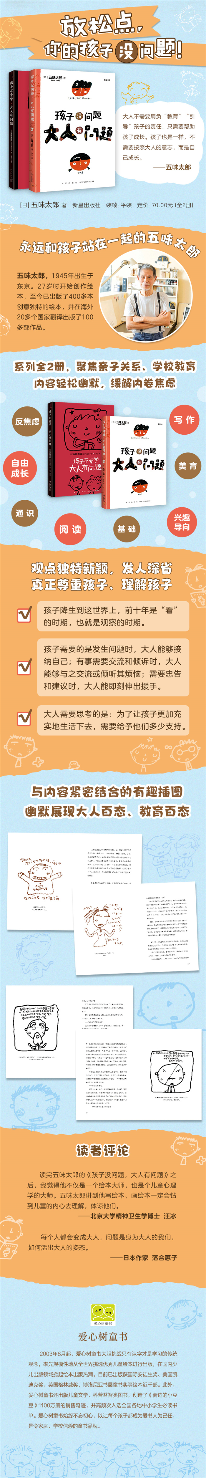 《孩子没问题,大人有问题》是绘本作家五味太郎的教育随笔,他引用身边大量实例,以独特的幽默感道破了现代教育的种种弊端和亲子关系的本质。全书讨论的亲子教育问题,在我们身边随处可见,而这些问题的根源都来自大人,一直担心焦虑的大人,总是不懂装懂的大人,喜欢教导孩子的大人……在五味太郎看来,我们现今所探讨的孩子的问题,其实都是大人的问题。