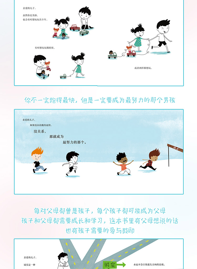 同时打破养育男孩女孩的刻板印象,告诉女孩你可以玩洋娃娃,但可以玩泥巴爱上踢足球,告诉男孩你可以喜欢玩卡车,也可以喜欢玩洋娃娃,你不一定跑得zui快,但是一定要zui努力的那个男孩。