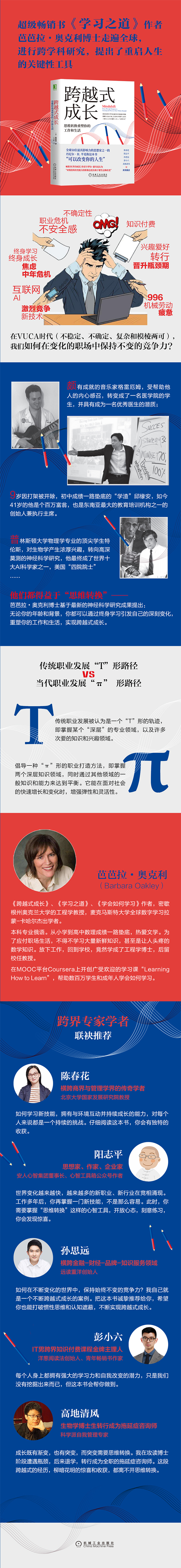 颇有成就的音乐家格雷厄姆,受帮助他人的内心感召,转变成了一名医学院的学生,并具有成为一名很好医生的潜质;9岁因打架被开除,初中成绩一路垫底的“学渣”邱缘安,如今41岁的他是个百万富翁,也是东南亚优选的教育培训机构之一的创始人兼执行主席。普林斯顿大学物理学专业的很好学生特伦斯,对生物学产生浓厚兴趣,转向高深莫测的神经科学研究,他很终成了世界十大AI科学家之一,美国“四院院士”……他们是如何成功完成职业的跨界转变的呢?尤其是在VUCA时代(不稳定、不确定、复杂和模棱两可的未来),我们必须学习和改造自己以适应新技术和不断变化的职业技能需求,这给我们职场人士带来了新的挑战。畅销书《学习之道》作者芭芭拉·奥克利博士走遍优选,进行跨学科研究,并基于近期新的神经科学研究成果,提出了“思维转换”的概念,即一种由学习引发的深刻变化,重塑你的工作和生活,帮助你实现跨越式成长。
