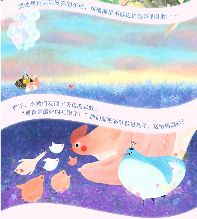 六只小鸡想为妈妈找一些特别的东西,作为世界上*好的生日礼物。他们乘着气球,去了野外,去了森林,去了海滨,去了灌木丛。到处都有闪闪发亮的东西,可惜都不是珍珠,也不是宝石。他们没有找到“*好的礼物”,还差点儿掉进大海,落入猫爪……*后,小鸡们发现了天边的彩虹。“那真是*好的礼物了!”可是,他们能把彩虹装进盒子吗?