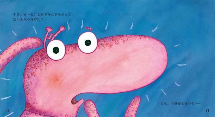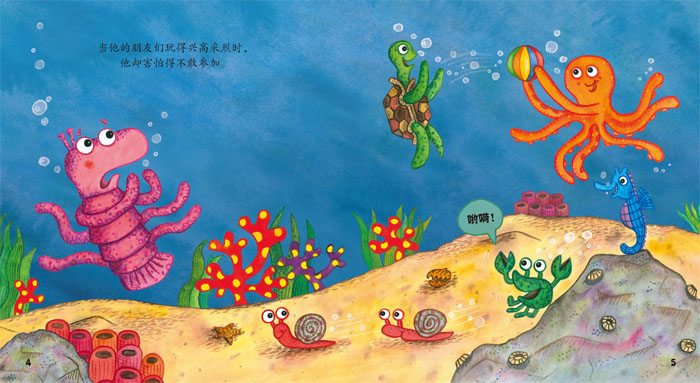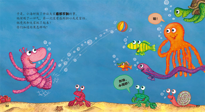 《胆小的海虾》:在大海深处住着一只小海虾,朋友们邀请他玩捉迷藏,他害怕;邀请他玩跳格子,他害怕;邀请他玩跳山羊,他还是害怕。小海虾太胆小了,无论朋友们怎么劝他,他都不敢玩任何游戏。终于有一天,没有朋友来找他玩了……为了改变这个情况,小海鲜该怎么办呢?