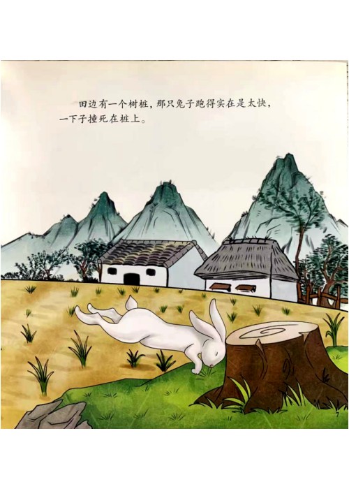 田边有一个树桩,那只兔子跑得实在是太快.一下子撞死在桩上。