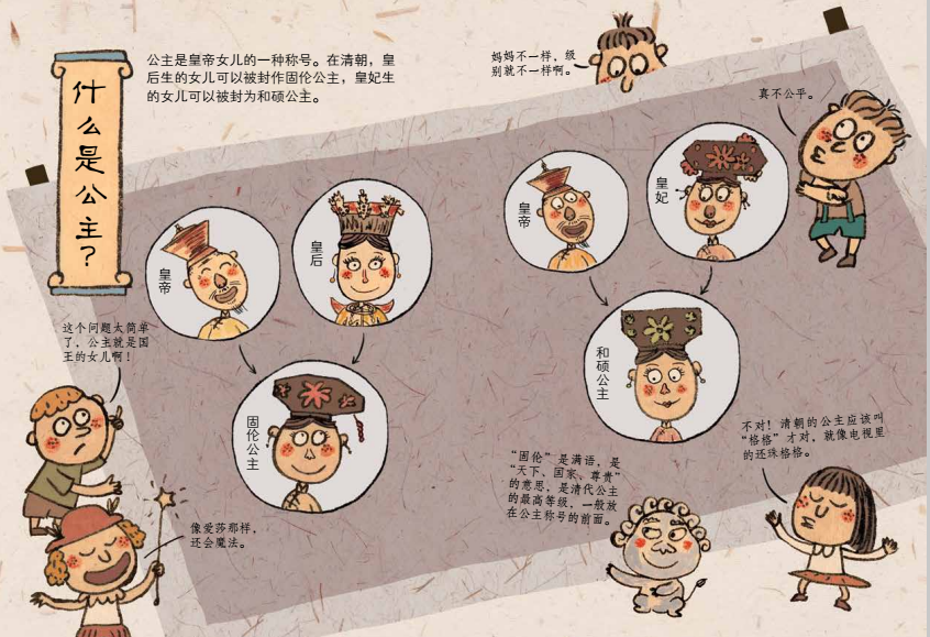公主篇也通过12个小问题,串联了孩子们所关心的问题:公主是皇帝女儿的一种称号,在清代,格格不一定都是公主。公主需要学习三从四德,也不能自由恋爱选择嫁给自己喜欢的人,有些公主身上还要背负“和亲”使命。所以身份虽高贵,却也有很多不如意的地方。