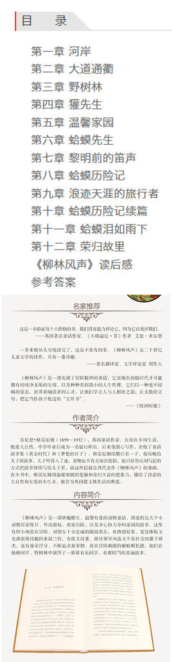 《柳林风声》讲述了四个好朋友的故事。在风光旖旎的泰晤士河畔,住着四个要好的朋友——憨厚的老鼠、机灵的鼹鼠、狂妄自大的蛤蟆、老成持重的獾。他们游山逛水,尽享大自然的天然恩赐。财大气粗而不知天高地厚的蛤蟆迷上了开汽车,却引发了不少车祸,受到朋友们的责难和管束。一次,他因偷了一辆汽车而被捕入狱。在狱卒女儿的帮助下,他化装成洗衣妇逃出监狱,历经险情和磨难,又在三位朋友的帮助下,夺回了被野树林动物侵占的蛤蟆府,并从此改邪归正。