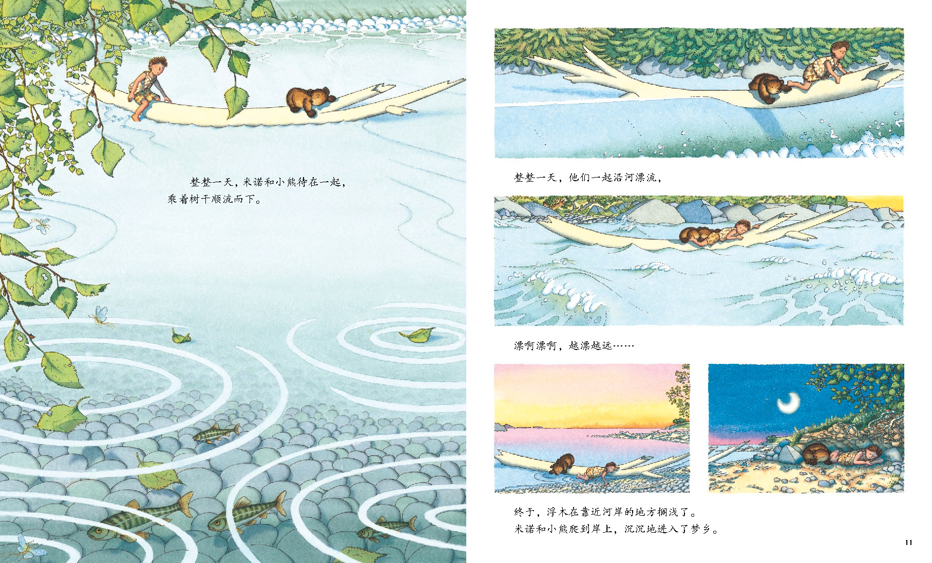 寒冷的天气、遥远的路途、铺天盖地的暴风雪、被惊扰的野牛群……作者以其极具动感的细部呈现、气势恢弘的全景构图、细腻丰富又色彩饱满的绘画,将幼小的米诺和小熊在广阔大自然里努力生活的情境完美展现;配以白描的文字,将米诺的坚毅、笃定、勇气与智慧彰显于一切恶劣境遇之中。