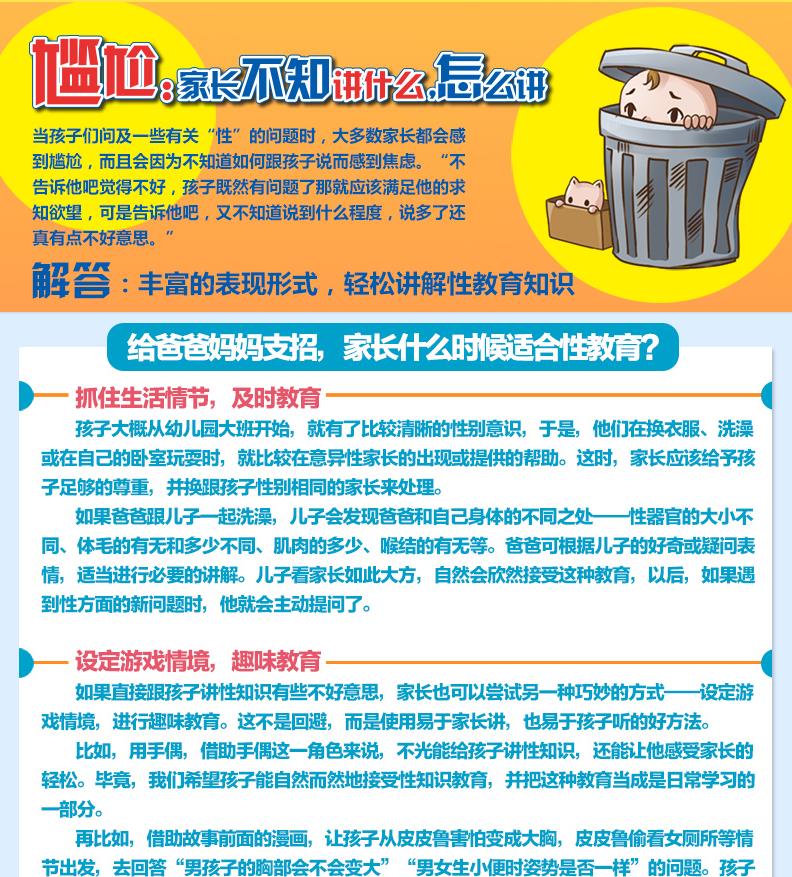 3-6岁:这个阶段让孩子对自己、对身体有个初步的认识。人是从哪里来的、为什么要天天洗屁屁,吃手指的坏习惯为什么一定要改,为什么女宝宝要蹲着上厕所……并且一定要告诉孩子背心裤衩覆盖的地方不让别人触摸。