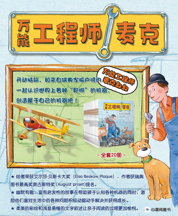 一套为3~6岁孩子打造的人物形象鲜明、内容生动丰富的机械科普绘本,全套20册,涉及汽车、赛车、农用车、工程车、飞机、火车、船舶等机械的认知。麦克会带着小狗布法,和你一起去认识和了解各种各样的机器,《去机场看飞机》《去港湾看船》《去赛车场看赛车》《去公路上看汽车》《去城市里看功能车》《去田地里看农用车》《去山顶上看雪地车》《去工地上看工程车》《去洗车房看洗车》《去麦克家看工具房》。麦克也会给小朋友们讲述机器曲折有趣的发明史,领略发明家的智慧。这些分册分别是《听麦克讲船的故事》《听麦克讲飞机的故事》《听麦克讲火车的故事》《听麦克讲拖拉机的故事》《听麦克讲汽车的故事》。另外还有麦克自己动手制造机械的故事:《麦克造小船的故事》《麦克造汽车的故事》《麦克建房子的故事》《麦克造飞机的故事》,更能启发和鼓励孩子们多动手、多动脑。而《麦克与布法的故事》讲述的是一直陪伴着麦克的小狗布法,想要帮助麦克,但是却惹出一堆令人捧腹的麻烦。