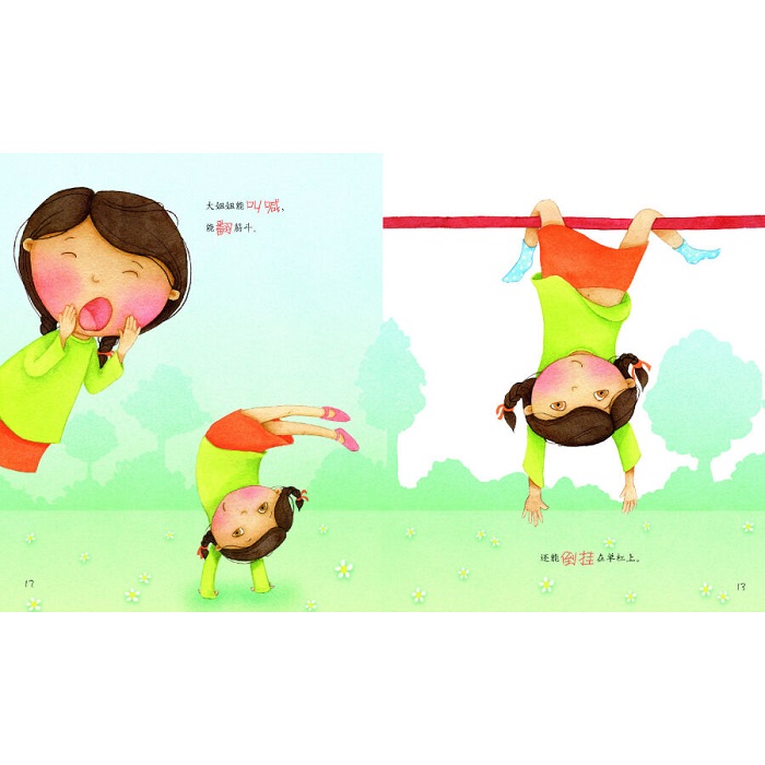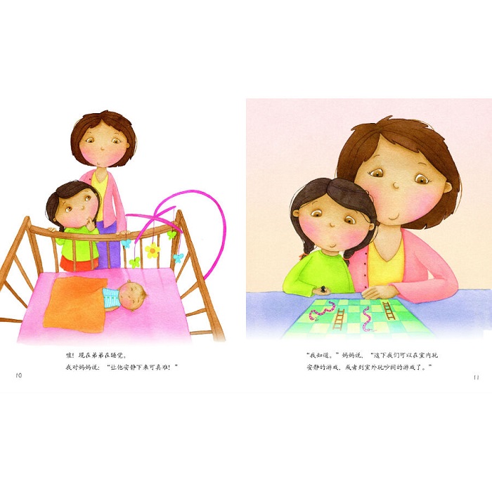 《当姐姐真好》讲述了一位幼儿园的小女孩儿有了弟弟的故事。作者告诉我们当姐姐是怎样一种感受。比如说你要知道,小婴儿要睡在婴儿车里;他大哭的时候有可能是饿了或者需要换尿不湿了;他睡觉的时候需要轻手轻脚;抱着他的时候要非常温柔。更重要的是,这本书也传达了这样一个信息,虽然家有老二,但是父母也一样爱老大。这是一个非常可爱的故事。