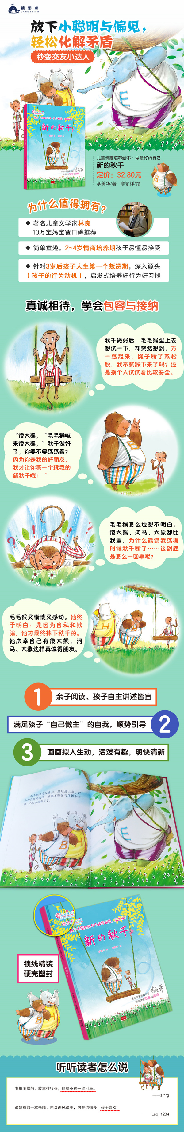 这是一个关于包容与接纳的故事。毛毛猴找来傻大熊、大河马、大蓝象测试自己新做的秋千是否安全,这几个他不喜欢的朋友——一个比一个胖,一个比一个重,他们坐着毛毛猴新做的秋千,荡呀荡,开心极了!猜一猜,当又轻巧又灵活的毛毛猴荡起秋千, 发生了什么?毛毛猴会接纳这几位又笨又重的朋友吗?傻大熊、大河马、大蓝象会包容毛毛猴的小心思吗?