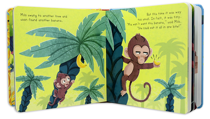 在丛林深处,高高的树上,住着两只猴子,米娅和米洛。今天是米娅的生日,米洛去寻找生日礼物,香蕉成为了礼物,可是寻找香蕉过程中碰到的有的太大,有的太小,还有的太重,都不是很满意。在后时刻只能随手拿一根送给米娅而感到抱歉,米娅却表示只要在重要的日子,我们在一起就是完美的。