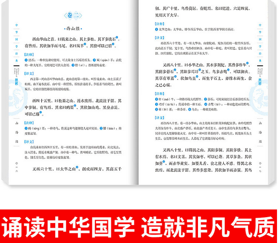 《山海经》与《易经》《黄帝内经》并称为上古三大奇书。这部奇书中,除详细介绍中华腹地的山川宝藏,还保存了大量的神话资料,并涉及不同学术领域的各个方面,诸如哲学、美学、宗教学、历史学、天文学、地理学、动物学、植物学、医药学、矿物学、民俗学、人类学等,可谓是汪洋恣肆、包罗万象。《山海经》分为《山经》和《海经》两部分,其中《山经》记载了山川地理、动植物和矿物等的分布情况;《海经》 记载了海内外各地的奇异风貌及上古神话。