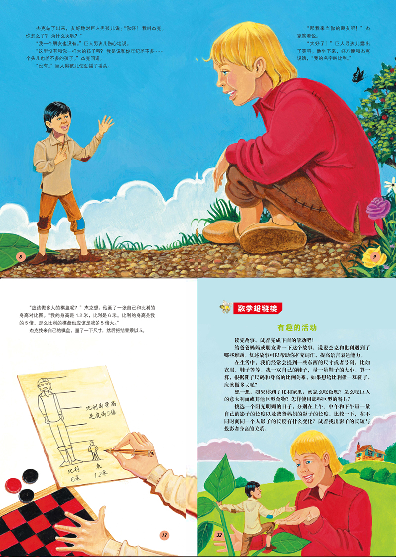 杰克爬上长长的豆茎,认识了一个新朋友。这位新朋友是个巨人男孩儿,足足有五个杰克那么高!他们想一起玩篮球,可巨人的篮球对杰克来说太大了。杰克想做一副巨人也能下的棋,怎么才能知道棋应该做多大呢?当杰克想邀请巨人去家里做客时,更大的麻烦出现了——他们需要做一个和豆茎一样长的绳梯,怎样才能量出豆茎的长度呢?