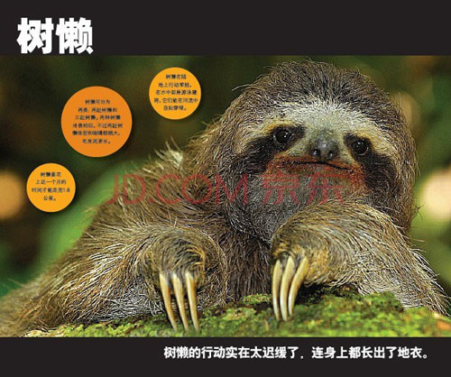 树懒厚厚的毛上长有绿色的藻类,这有利于它们和周围的树木融为一体。树懒也会将这些粘糊糊的藻类当作可口的点心。