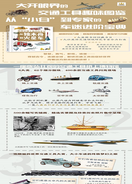图鉴式收藏级交通工具大百科 一座交通工具纸上博物馆,纵览改变人类历史的出行史 从史前冒险到太空探索,全景展示交通工具发展时间线 解剖图、原理图、示意图、实景照片,多角度解析交通工具 分类图解知识点,专业级资料拓展,收获更多领域常识 附各类索引辅助查询,供大小车迷爱好者查阅、浏览、学习 专家团来自—— 英国皇家学会 美国航空航天协会