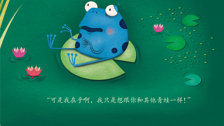 一个大青蛙生下来就是蓝色的,他发现别的青蛙都是绿色的,他开始特别忧愁,为了弄明白这个问题,他开始问周围的朋友,虽然周围的朋友都认为他虽然是蓝色的青蛙,也没关系。老青蛙的一句话让他茅塞顿开,老青蛙说:“你是蓝色的,因为你就是蓝色的”。每个人的独特之处是不需要理由的,因为天生就是如此。即使和别人不一样也没关系,做自己才重要!