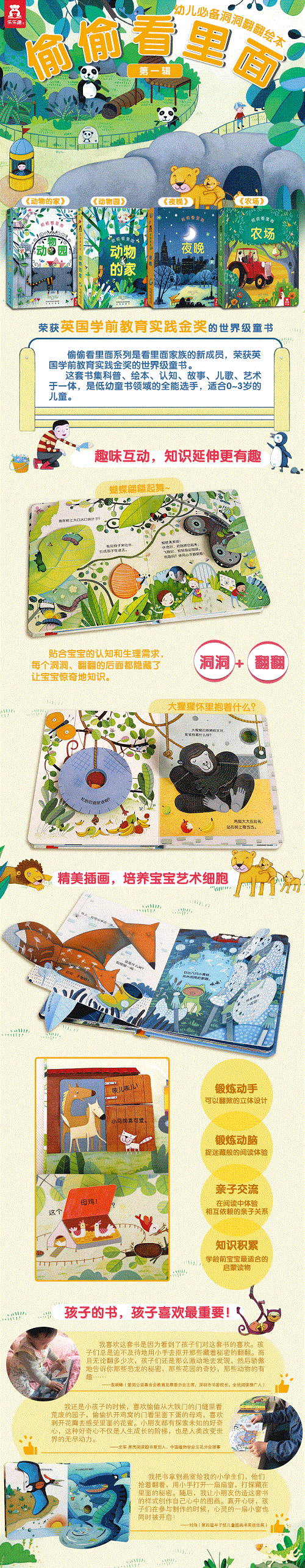 该系列引进自英国usborne出版社,是看里面系列的新产品。洞洞 翻翻书的形式趣味十足,动物、自然的主题十分贴近生活,色彩鲜艳、充满美感,语言朗朗上口。书中巧妙地设计了许多问题,激发孩子的阅读兴趣,同时兼具启蒙认知功能。