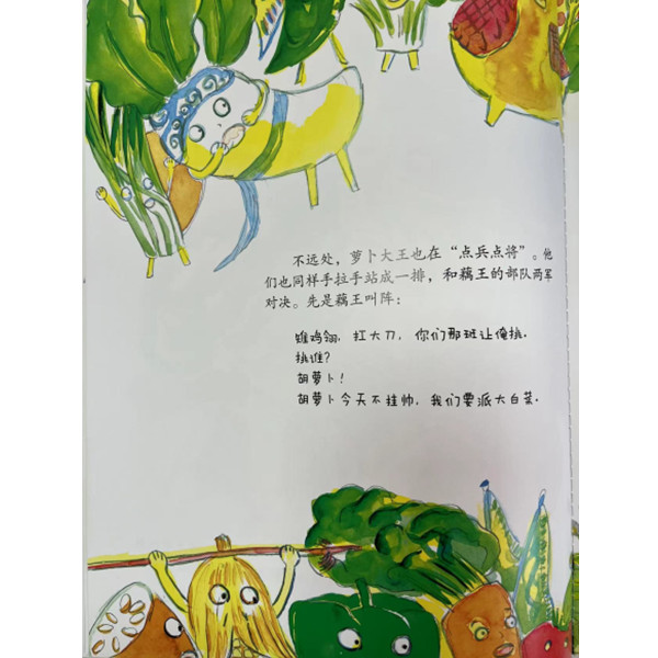 《雉鸡翎,扛大刀》是“中国记忆•传统游戏图画书”系列中的第一本。这本图画书主要介绍了三个古代儿童游戏“点兵点将”“雉鸡翎,扛大刀”“城门城门几丈高”。故事通过小夏和厨师寻找丢失的娃娃戏表演服和出逃的蔬菜、水果为线索,将这几个游戏的玩法生动有趣地予以展现,让蔬菜、水果、小动物和人一起玩游戏,营造了热闹有趣的游戏气氛。同时,书中还巧妙致敬了我们耳熟能详的传统童谣《雉鸡翎,抗大刀》《城门城门几丈高》《一园青菜成了精》,妙趣横生。