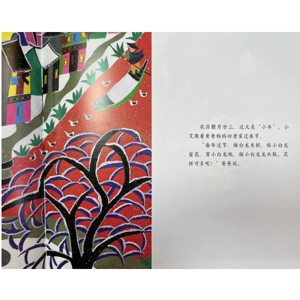 上海市非物质文化遗产——金山农民画是在江南民间艺术土壤中滋生出来的一棵新苗。她以江南乡土艺术为契机,合着生活的脉搏,集众人之智慧,发人本之创造,于上世纪七十年代末创立了我国现代民间绘画的新风格,受到中外专家们的肯定和广大观众的厚爱。 金山农民画源自古老的江南地区汉族民间艺术,以江南水乡风土人情为主要题材,融合刺绣、剪纸、蓝印花布、灶头壁画、雕塑、漆绘等民间艺术表现手法,运用大胆的艺术夸张和强烈的色彩反差,以拙胜巧。 不同于常见的叙事风格的绘本,这套金山农民画绘本每一页的人物造型、色彩都有变化,配色更加大胆,更加追求单幅作品的完整性和视觉冲击力,以充分体现金山农民画的艺术特色和精髓。