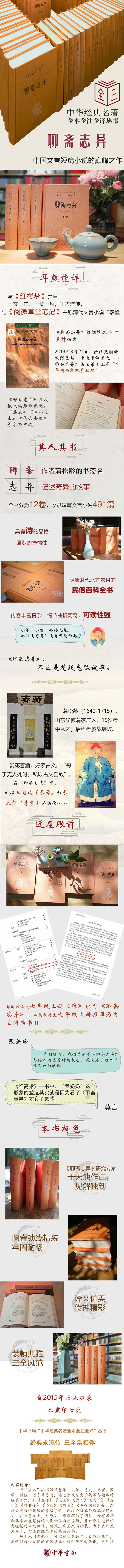 《聊斋志异》是我国著名文学家蒲松龄所著的文学巨著。全书分为12卷,收录短篇文言小说491篇。蒲松龄在继承魏晋志怪和唐宋传奇传统的基础上,以隽永之笔、博爱之情,取得了中国文言小说创作的高成就,本书也就成为一部家喻户晓、妇孺皆知的不朽作品。     本书的译文采用书局孙通海等人所译“文白对照”本《聊斋志异》的译文部分,又约请《聊斋志异》研究专家于天池先生做了注释、题解,并对译文进行了修改。本书的注、译、题解中时见独到见解,对于读者阅读理解大有禆益。