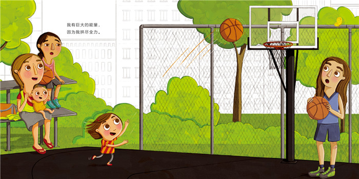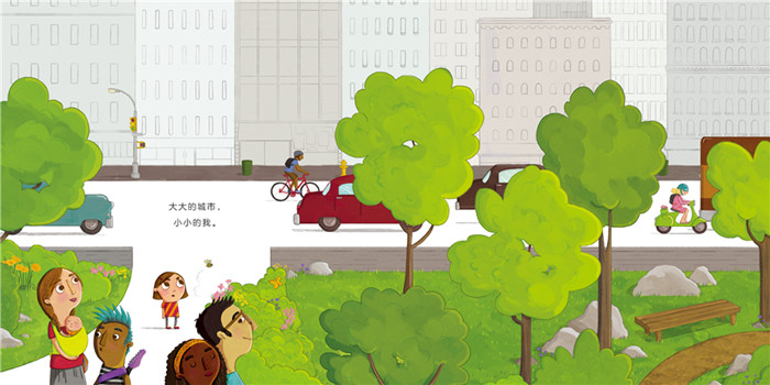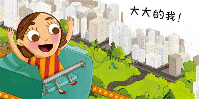 故事中的小女孩以为自己是渺小的,在她的眼中,一切都是比自己大的:大大的城市,宽宽的马路,高高的楼房,而她个子小小的;喧嚣的大街,而她步子小小的……直到她发现,她的梦想很大,因为她是个艺术家;她在打球的时候,有巨大的能量,因为她拼尽全力;她的爱很大,因为她也被爱着……从此,她意识到只要勇敢做自己,她就是大大的!