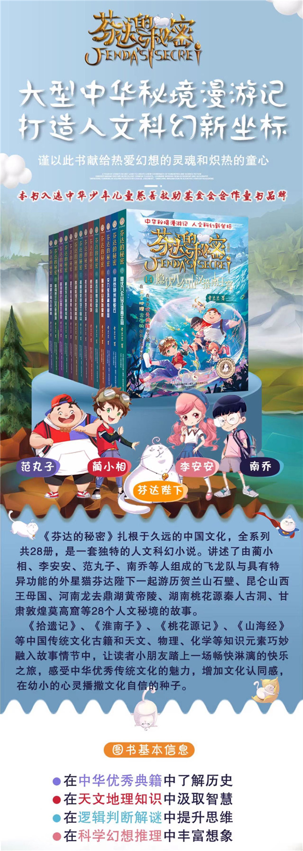 《芬达的秘密》扎根于久远的中国文化,全系列共 28册,是一套独特的人文科幻小说。讲述了由蔺小相、李安安、范丸子、南乔组成的飞龙队与具有特异功能的外星猫芬达陛下一起游历贺兰山石壁、昆仑山西王母国、河南龙去鼎湖黄帝陵、湖南桃花源秦人古洞、甘肃敦煌莫高窟、山东蓬莱三仙山、湖北神农架、河北邯郸娲皇宫、陕西骊山秦始皇陵、安徽八公山汉淮南王宫、河南汉魏洛阳故城、江苏金陵明珠玄武湖等人文秘境的故事。《过秦论》《晋书》《桃花源记》《山海经》《穆天子传》《史记》《春秋左氏传》这些中国传统文化古籍和天文、物理、化学等知识元素巧妙融入故事情节中,让读者小朋友踏上一场畅快淋漓的知识之旅,感受中华优秀传统文化的魅力,增加文化认同感,在幼小的心灵播撒文化自信的种子。 历史古籍+科学想+逻辑推理+体验式插图带领小小少年走进尘封历史,传承优秀文化
