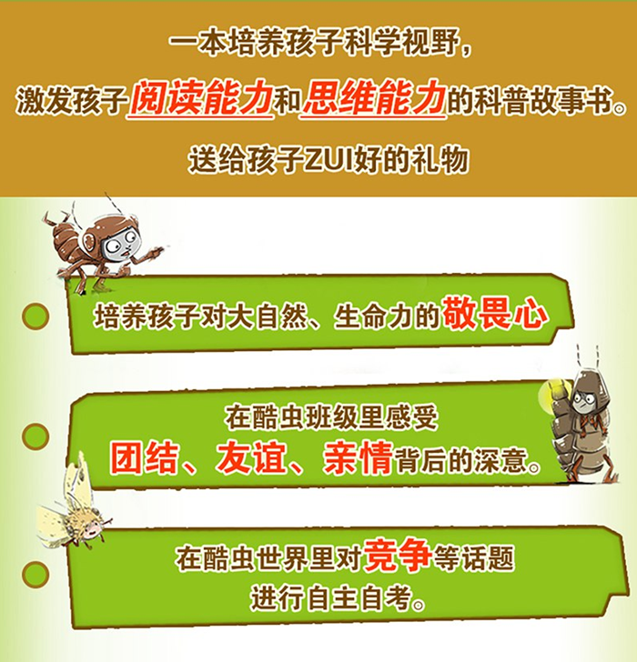 ★ 继昆虫学家法布尔的《昆虫记》后,结合现代新教育,培养孩子科学视野、激发孩子阅读能力和思维能力的昆虫科普丛书!系列图书累计销量超过300万册! ★ 中科院昆虫专家严格审定,收入大自然近200余昆虫,保证知识的丰富性、科学性、准确性 ★ 以多角度拟人的写作手法将令人害怕的虫子置身校园,轻松幽默的校园故事满足家长和孩子寓教于乐的阅读需求 ★ 可爱传神的漫画形象,精致洗练的场景画面,激发孩子的绘画兴趣 《酷虫学校》系列图书销售销量超百万册!版权输出韩国、台湾,被当地小朋友誉为“超好玩的科普故事书”! 中国科学院昆虫专家刘晔,特约审稿推荐——“看过很多科普书,能把昆虫知识描绘得如此趣味横生,让孩子们这样喜欢,这是*套!”