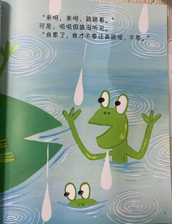 池塘边,青蛙们跳个不停。 蹦 蹦 太好玩了! 不过天天下雨,太烦人了! 就是,还是想冲着偶尔探个头的太阳跳啊!青蛙们望着天空说。