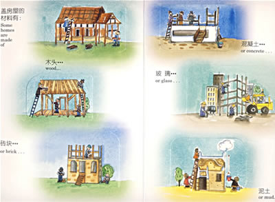 1.各种各样的房屋:你住在哪里?你的房子是平房还是楼房?在城里还是在乡村?你的房子是由砖块、木头建成的吗?有大片的玻璃吗?有些小朋友住在沙漠中,有些住在森林里,还有人住在冰天雪地上呢!很多人的房屋是由布料、泥土、木头或者冰块建成的。这本“乐乐趣”翻翻书帮你认识:世界各地各样的房屋,无论如何,你会发现,还是自己的家最好!