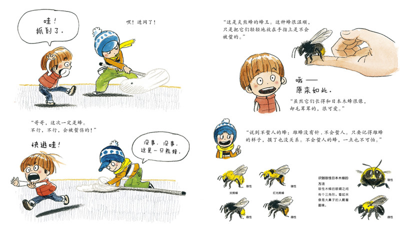 《我们一起捉昆虫》和《冬天里,去捉虫》两本作品都体现了作者保护环境,敬畏自然的价值观。作者在采访中谈到: “只有从小就了解自然亲近自然的孩子,长大了才不会随意地破坏自然。”于是作者特意选取了观察自然的题材,让孩子们明白不用去很远的地方,大自然就在自己的身边。从身边的小小昆虫开始,进而了解植物、动物和大自然,明白我们每个人都是与自然相连的个体。