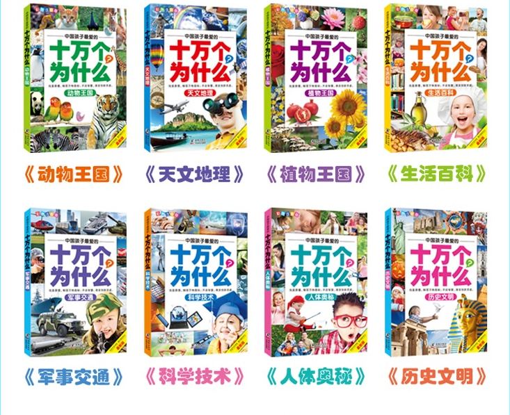 嘉良传媒编绘的这套《中国孩子*爱的十万个为 什么(彩图注音版*新版共8册)》丛书以简洁、** 、生动的文字为孩子们解答从宇宙太空到地球万物, 从动物世界到植物王国,从军事交通到神秘的人体, 从日常生活到文明历史的各种疑惑,精美的图片既给 孩子带来赏心悦目的视觉效果,又能弥补文字描述的 缺憾,让孩子能够*加直观地感受到科学的无处不在 。而“知识加油站”小栏目*是孩子开阔视野、拓展 知识面的好帮手。
