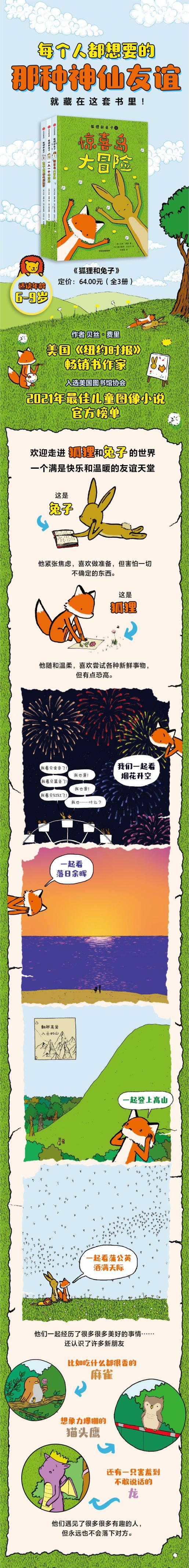 这是一套关于友谊的魔法故事,是一套适合6-9岁孩子阅读的图像小说,给小读者带去温暖和力量。 当随和温柔的狐狸遇到紧张焦虑的兔子,会发生什么呢?他们的性格看起来完全相反,可不知为何,却是非常完美的一对儿。无论是寻找宝藏,还是在自家的后院种起一片菜园,狐狸和兔子总能在每一个转角找到让彼此快乐的魔法。 他们一起看日落,一起看蒲公英漫天飞舞,一起大口大口地嚼棉花糖。他们也会一起面对新的困难和挑战,比如、下海游泳、寻找惊喜岛……幸好,没有什么事儿是两个小伙伴在一起不能解决的。 他们还有可爱的好朋友:想象力爆炸的猫头鹰、吃什么都很香的麻雀和总是慢一拍的乌龟……每个人性格不一,却互相包容、互相鼓励,快乐地生活在一起,真是一群开心的小伙伴!