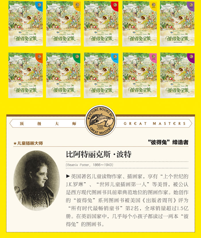 《**大师绘本·彼得兔全集(全10册)》绘本鼻祖;百年经典,销量过亿;史上首创8开**开本;史上首创纯美绘本风格;全美教育协会100本**童书;美国《出版者周刊》“所有时代*畅销童书”第2名,每个孩子都应该拥有的一套经典。