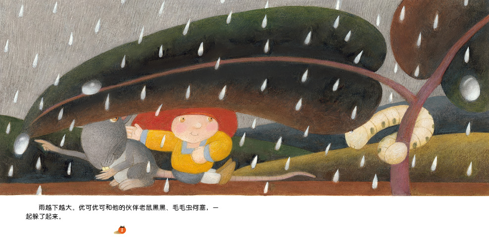 优可优可(Yok~Yok)来自一个被好奇的乌鸦啄开的核桃中。他是一个很老很老的、带着红色的蘑菇帽的精灵,被仙女在核桃里封印了近三十年。没有人知道它到底多大了,它有两个朋友,一个是黑鼠,一个是毛毛虫,他们一起走过了一段和自然共舞、与魔法同行的幽默旅程。雨滴滴答答,好美啊。它是怎么来的?YOKYOK说:“我有一个很美的故事要告诉你。”